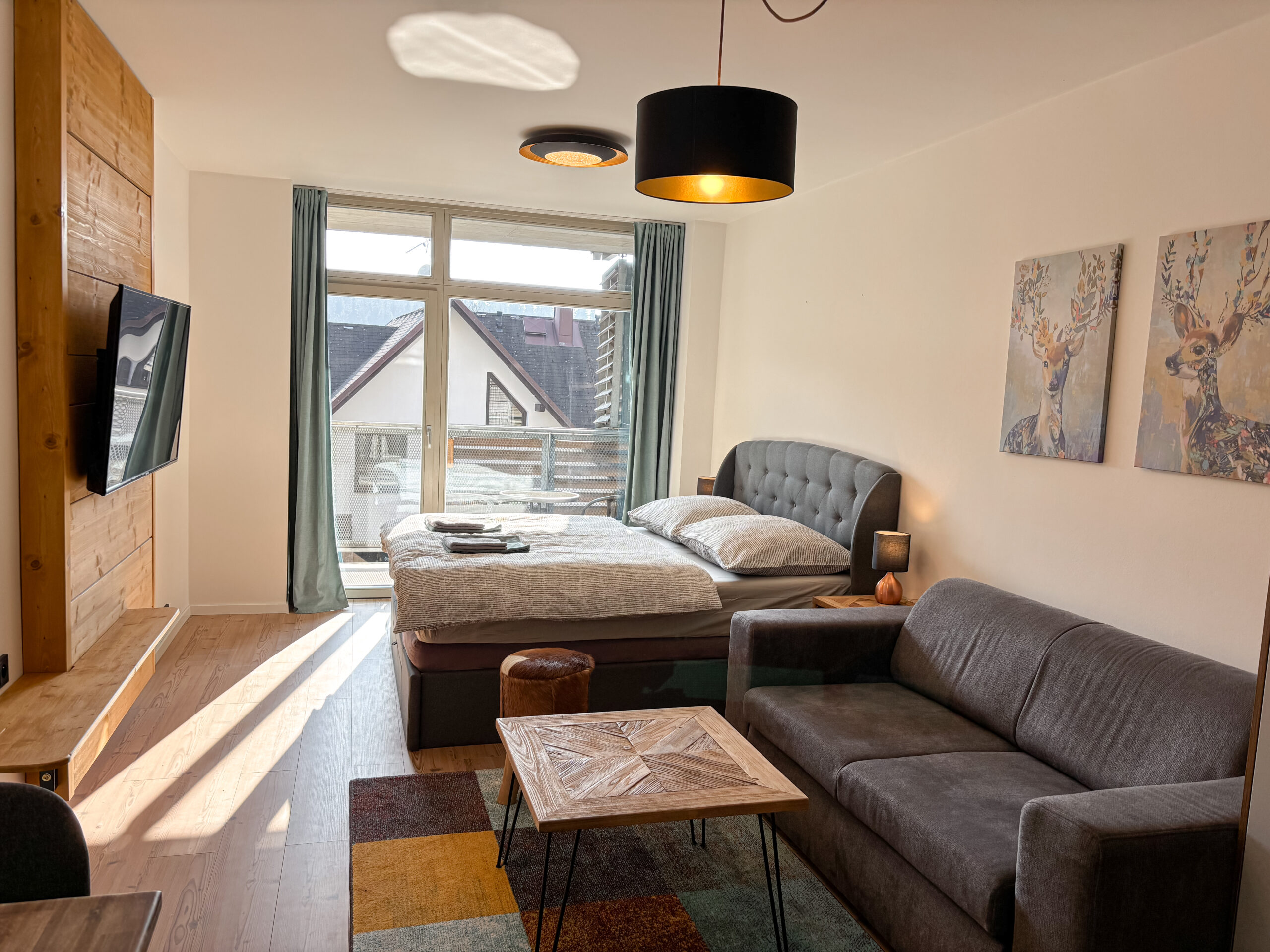 Nabízíme prodej bytové jednotky v centru Harrachova. Byt je dispozičně řešený jako 1+kk o podlahové ploše 34m² + balkon 6,5m². Jednotka se nachází ve 3.NP šestipodlažní novostavby bytového domu z roku 2006 s výtahem. Byt se skládá z pokoje s plně vybaveným kuchyňským koutem, koupelny s vanou a toaletou, komory a chodby s vestavěnými skříněmi. Dále k bytu náleží parkovací stání v 1.PP bytového domu. Okna bytu jsou orientovaná na jihozápad s výhledem na Čertovu horu včetně skiareálu se skokanskými můstky. Ústřední vytápění zajištuje centrální kotelna v domě, jednotka má vlastní měření tepla, ohřev vody je řešený elektrickým bojlerem. Bytová jednotka je ve velmi dobrém technickém stavu po provedené kompletní modernizaci v roce 2022. Byt se nachází přímo v centru Harrachova, v blízkosti restaurací, obchodů a pěší dostupnosti skiareálu. Byt je vhodný pro rodinnou rekreaci i jako investiční příležitost.
